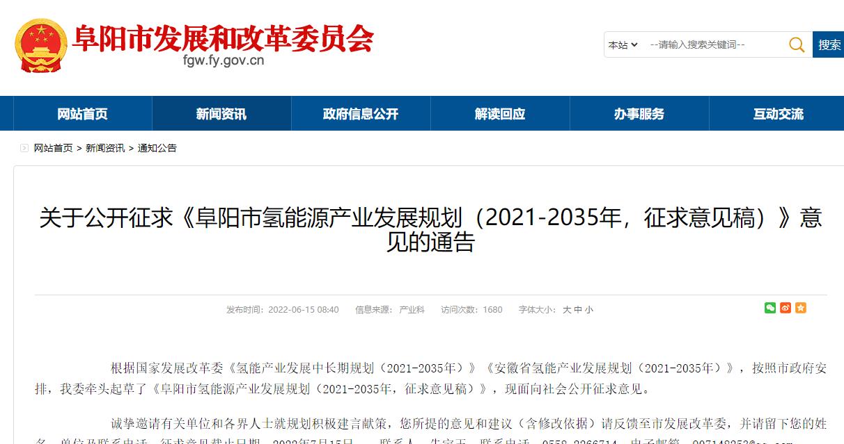 氫啟未來網獲悉,根據國家、安徽省氫能產業發展相關規劃,日前,阜陽市發改委牽頭起草了《阜陽市氫能源產業發展規劃(2021-2035年,征求意見稿)》(以下簡稱《征求意見稿》),面向社會公開征求意見。