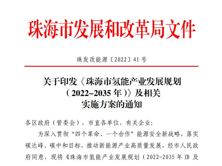 氫啟未來網獲悉,近期珠海市發展和改革局在其官網發布關于印發《珠海市氫能產業發展規劃(2022-2035 年)》及相關實施方案的通知!