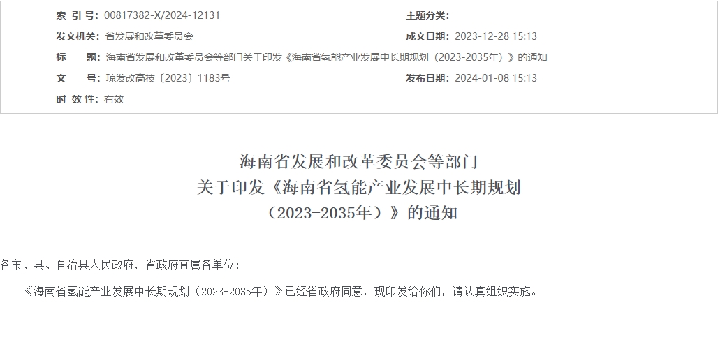 海南省七部門聯合印發《海南省氫能產業發展中長期規劃(2023-2035年)》