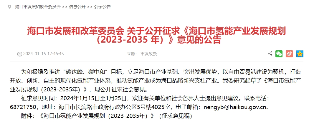 1月15日,海口市發展和改革委員會研究起草了《海口市氫能產業發展規劃(2023-2035年)》,現公開征求社會意見。