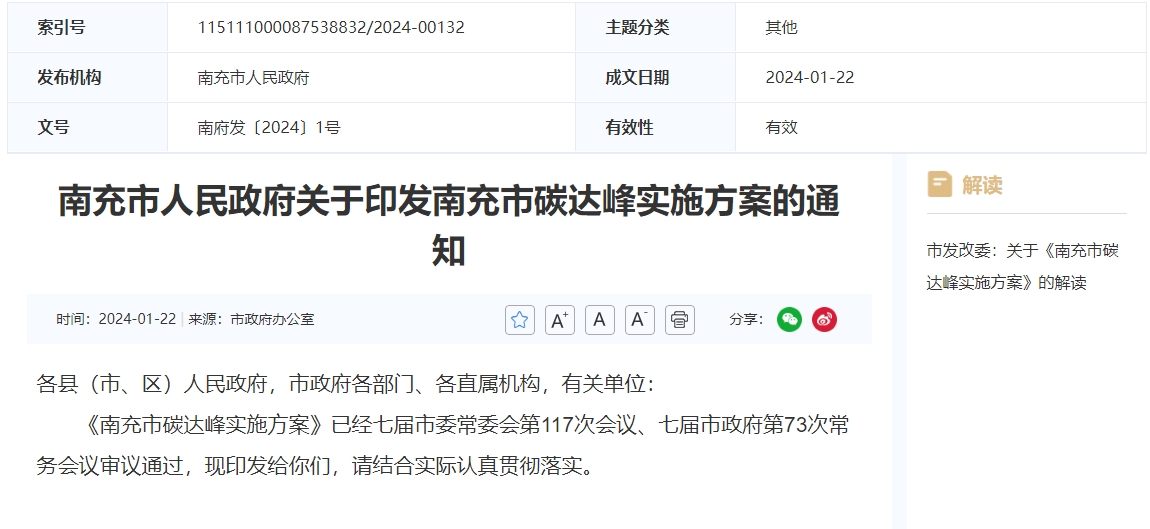 氫啟未來網獲悉,近日,四川省南充市為了穩妥推進碳達峰、碳中和重大戰略決策及相關工作部署,印發了《南充市碳達峰實施方案》。