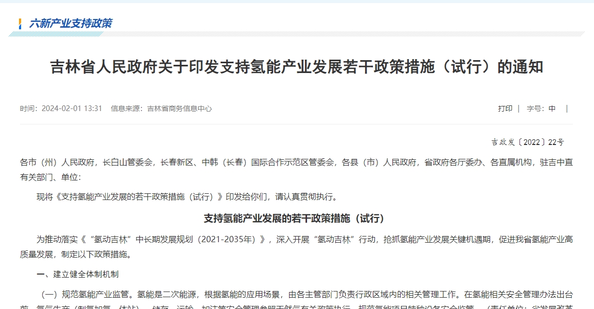 氫啟未來網獲悉,2月1日,吉林省人民政府在其官網發布了關于印發支持氫能產業發展若干政策措施(試行)的通知。