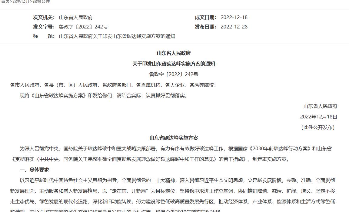 12月28日,山東省人民政府印發《山東省碳達峰實施方案》的通知