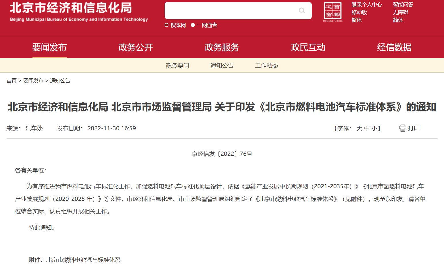 氫啟未來網獲悉,11月30日,北京市經濟和信息化局聯合北京市市場監督管理局發布《北京市燃料電池汽車標準體系》的通知。