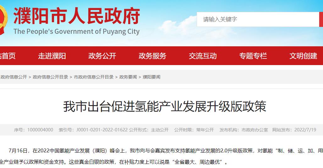 7月16日,在2022中國氫能產業發展(濮陽)峰會上,濮陽市向與會嘉賓宣布支持氫能產業發展的2.0升級版政策,對氫能“制、儲、運、加、用”產業鏈提供政策和資產支持。為有效加快氫能產業發展,推進鄭汴洛濮“氫能走廊”與鄭州國家氫燃料電池汽車示范城市群融合發展,濮陽市近日再次發布扶持辦法,推動氫能產業發展,具體如下: