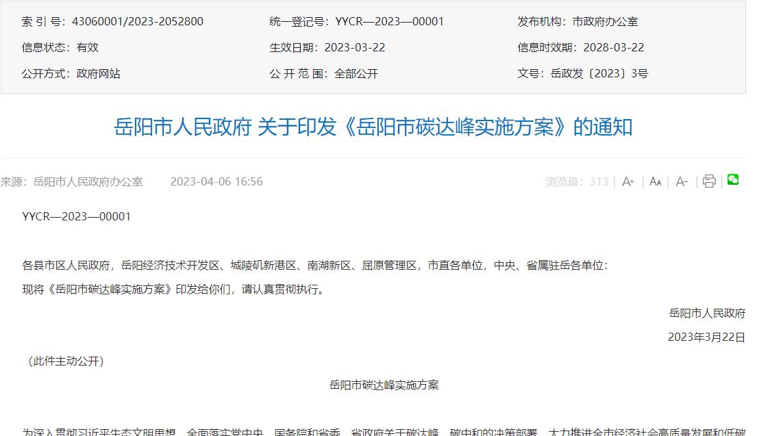 氫啟未來網(wǎng)獲悉,4月6日,岳陽市人民政府辦公室發(fā)布關(guān)于印發(fā)《岳陽市碳達(dá)峰實(shí)施方案》的通知