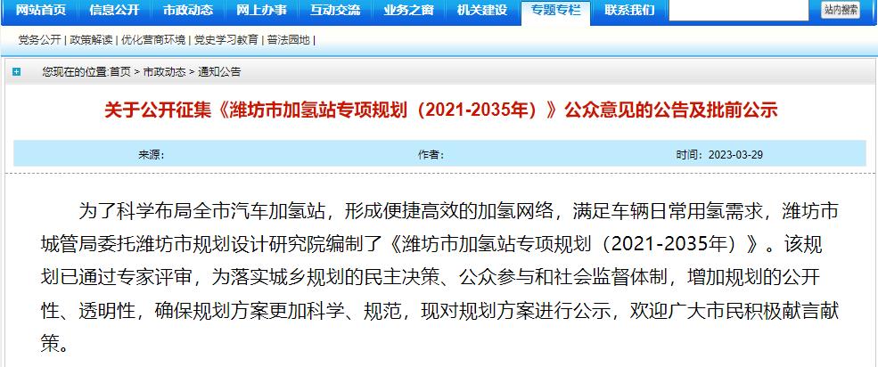 氫啟未來網(wǎng)獲悉,近日,為了科學(xué)布局濰坊市汽車加氫站,形成便捷高效的加氫網(wǎng)絡(luò),滿足車輛日常用氫需求,濰坊市城管局委托濰坊市規(guī)劃設(shè)計(jì)研究院編制了《濰坊市加氫站專項(xiàng)規(guī)劃(2021-2035年)》。