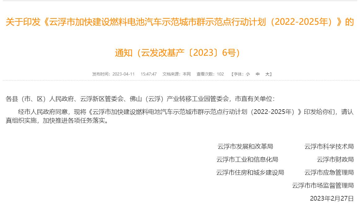 氫啟未來網(wǎng)獲悉,4月11日,云浮市發(fā)展和改革局等7部門聯(lián)合印發(fā)《云浮市加快建設(shè)燃料電池汽車示范城市群示范點(diǎn)行動(dòng)計(jì)劃(2022-2025年)》。