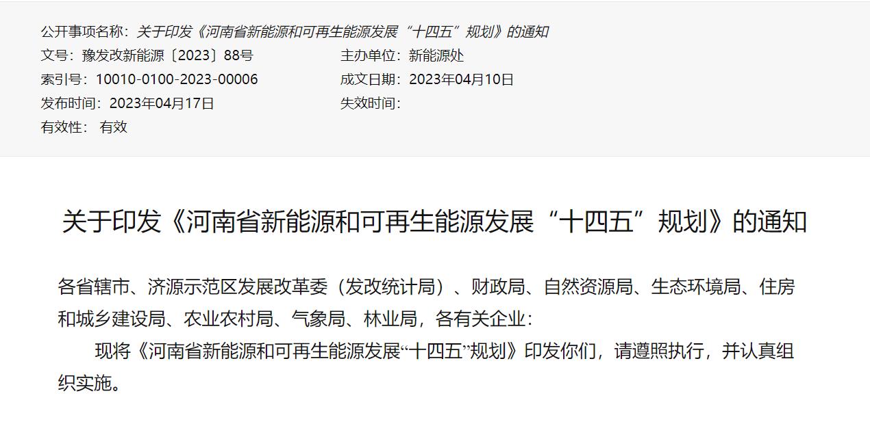 氫啟未來網(wǎng)獲悉,4月17日,河南省發(fā)展和改革委員會(huì)、河南省財(cái)政廳、河南省自然資源廳、河南省生態(tài)環(huán)境廳、河南省住房和城鄉(xiāng)建設(shè)廳、河南省農(nóng)業(yè)農(nóng)村廳、河南省氣象局、河南省林業(yè)局聯(lián)合印發(fā)《河南省新能源和可再生能源發(fā)展“十四五”規(guī)劃》