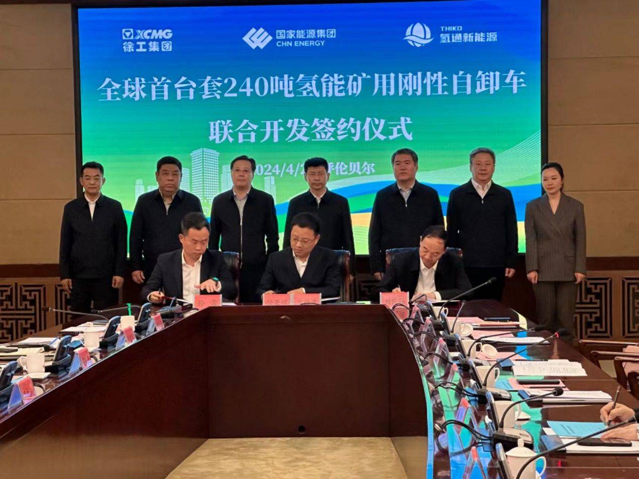 2024年4月24日下午,國(guó)家能源集團(tuán)、徐工集團(tuán)、氫通新能源三方在呼倫貝爾舉行全球首臺(tái)套240噸氫能礦用剛性自卸車聯(lián)合開發(fā)簽約儀式。國(guó)能寶日希勒能源有限公司總經(jīng)理劉民強(qiáng)、徐州工程機(jī)械集團(tuán)有限公司黨委副書記、集團(tuán)總經(jīng)理孫雷、氫通(上海)新能源科技有限公司董事長(zhǎng)兼CEO任亞輝分別代表三方進(jìn)行簽約。呼倫貝市市委副書記、市長(zhǎng)及永乾、市委常委、常務(wù)副市長(zhǎng)胡兆民、市政府秘書長(zhǎng)徐景睿、市工信局局長(zhǎng)魏云鵬、市能源局局長(zhǎng)何偉...