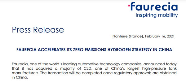 ?2月16日,佛吉亞(FAURECIA)宣布已收購(gòu)中國(guó)最大高壓氣瓶公司斯林達(dá)(CLD)大部分股權(quán),交易將在獲得相關(guān)部門(mén)審批后完成。截止目前,雙方并未透露具體的收購(gòu)金額。根據(jù)了解,此次收購(gòu)為絕對(duì)控股,雙方將為中國(guó)市場(chǎng)開(kāi)發(fā)生產(chǎn)III型和IV型儲(chǔ)氫罐。