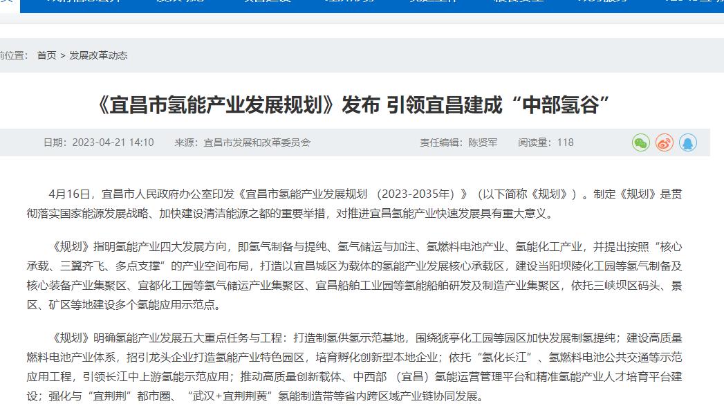 氫啟未來網獲悉,4月16日,宜昌市人民政府辦公室印發《宜昌市氫能產業發展規劃 (2023-2035年)》(以下簡稱《規劃》)。