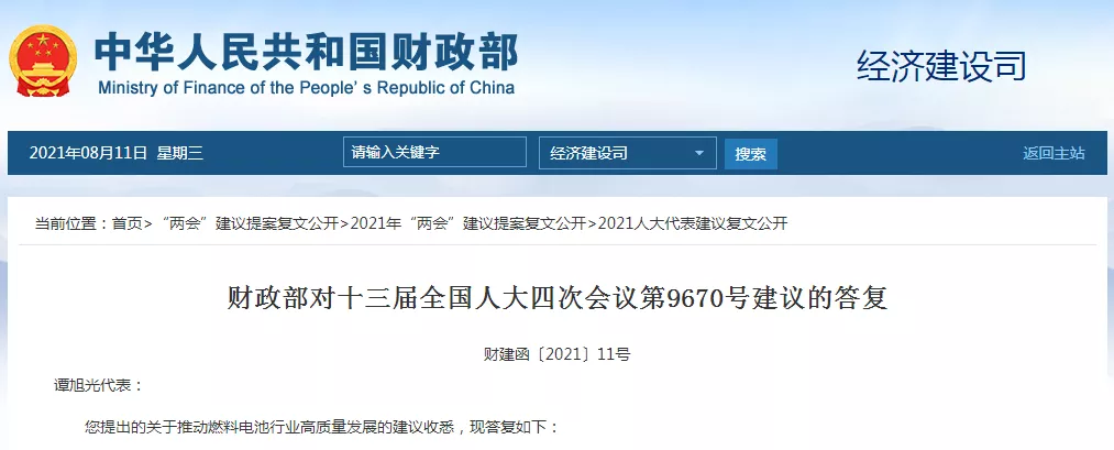 財(cái)政部近日對(duì)人大代表的建議提案進(jìn)行了回復(fù)。在這些提案中,部分人大代表提出將山東省、成渝市、內(nèi)蒙古包頭市納入燃料電池示范城市群的建議。