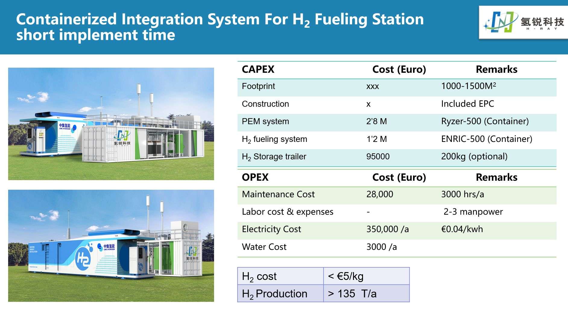 歐洲法規(guī)并沒有限制制氫需要在化工園區(qū),而是需要環(huán)境和能源部門審批,在加油站擴(kuò)建制氫加氫站,利用交易電價(jià)(PPA)制氫,將大大降低氫的成本,采用一臺(tái)Ryzer500撬裝一體化制氫設(shè)備,配合撬裝儲(chǔ)氫和壓縮系統(tǒng),占地約1500平米,每天制氫超過500kg,年制氫135噸。制氫成本為5歐元/kg,將更加有利的推動(dòng)氫能交通的發(fā)展。