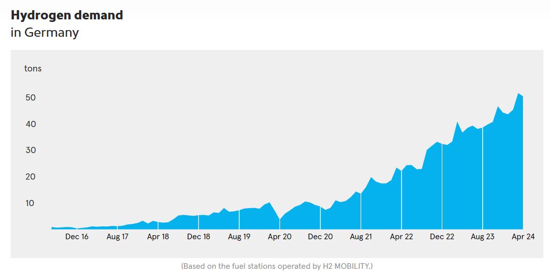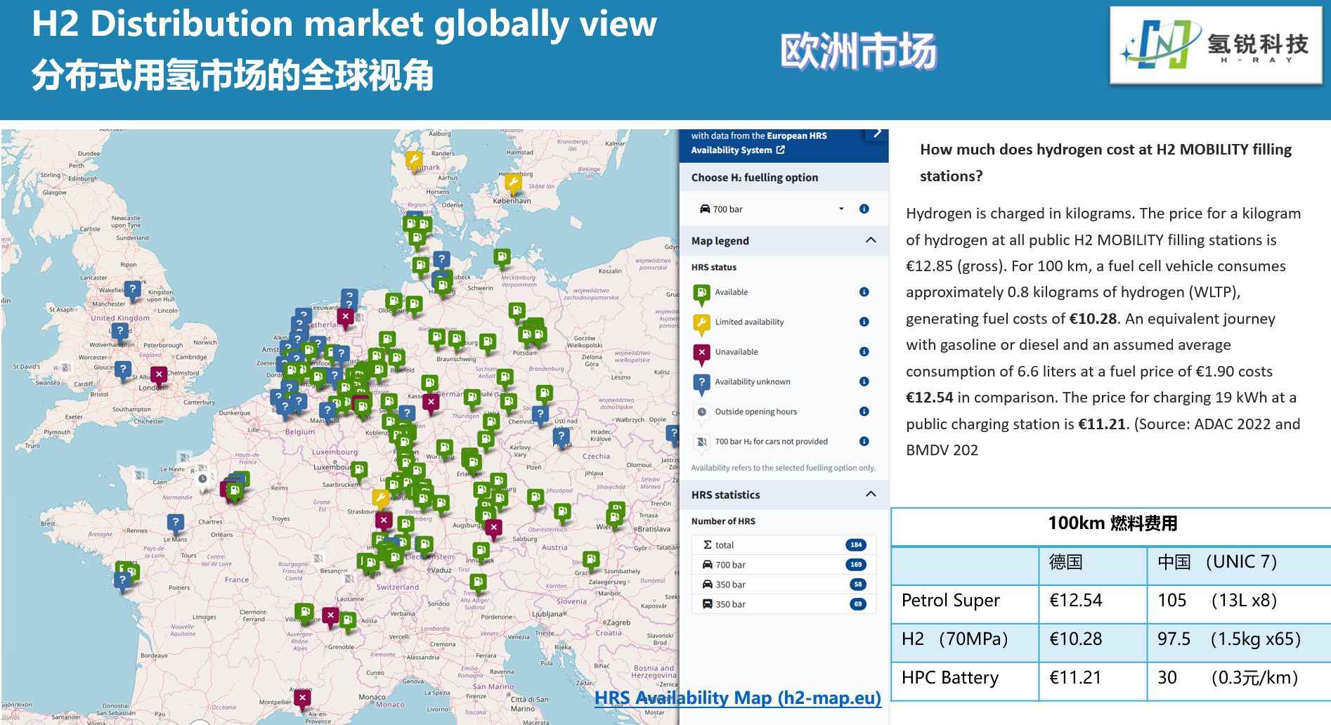 燃料成本決定出行方式,以100公里為例,采用95號(hào)汽油,其費(fèi)用為12.54歐元,采用氫氣費(fèi)用為10.28歐元,采用電車充電費(fèi)用為11.21歐元,歐洲電價(jià)貴和充電樁少,充電需要辦會(huì)員卡,這都是推動(dòng)了氫燃料電池交通的快速發(fā)展的因素。從H2MOBILITY 統(tǒng)計(jì)的數(shù)據(jù)來看,2018后,也就是俄烏沖突后,由于天然氣成本的上升導(dǎo)致電價(jià)的上升。 但是,采用可再生能源制氫的氫價(jià)相對(duì)比較穩(wěn)定,推動(dòng)了氫能交通的發(fā)展。