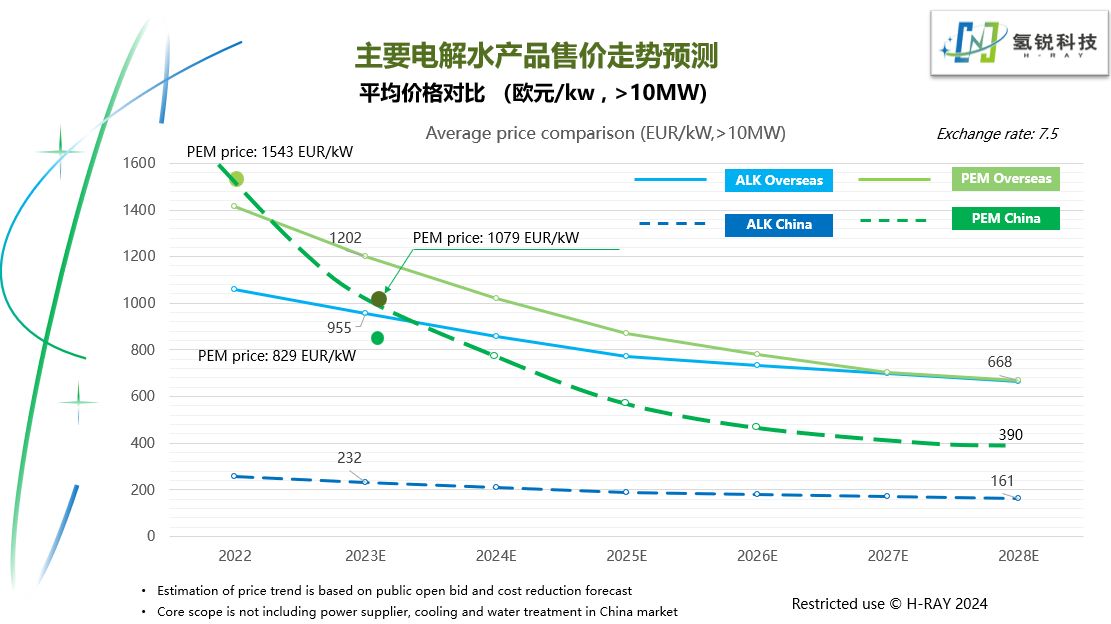 經(jīng)過5年的發(fā)展,國內(nèi)的PEM制氫企業(yè)加大了人才的培養(yǎng)、核心工藝的研發(fā)能力、專用設(shè)備的自動(dòng)化和核心材料產(chǎn)業(yè)鏈上下游的協(xié)同發(fā)展。 2023年公開資料顯示,國內(nèi)的MW級(jí)PEM制氫系統(tǒng)價(jià)格在850萬-900萬之間。同期歐洲的MW級(jí)PEM制氫設(shè)備價(jià)格也在1050-1200€/kw。 兩者價(jià)格非常接近。隨著國內(nèi)更多企業(yè)的加入,國產(chǎn)PEM電解槽將會(huì)達(dá)到250Nm3/h 或者更高的500Nm3/h。 采用了增強(qiáng)膜技術(shù)后,PEM電解槽可以采用更高的電密,電解槽大型化和高電密這對(duì)組合拳將進(jìn)一步降低PEM電解水設(shè)備的初期投資。