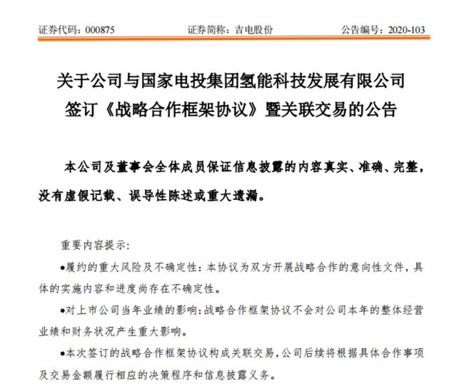 [ 導讀 ]集微網消息,12月23日晚間,吉電股份公告,公司與國家電投集團氫能科技發展有限公司(簡稱“氫能科技”)簽署了《戰略合作框架協...