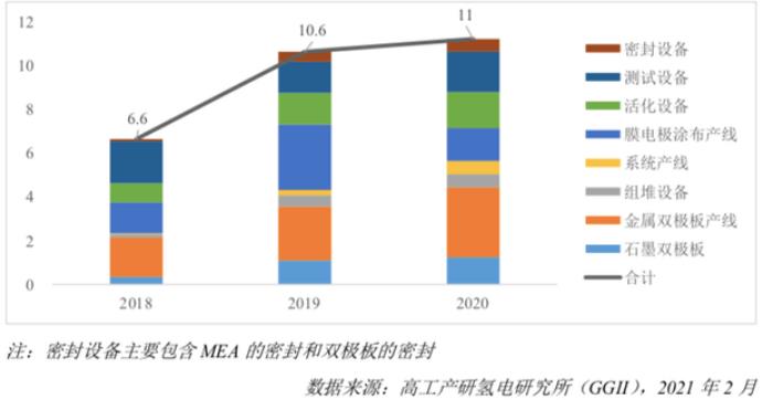 近期,高工產研氫電研究所(GGII)發布的《2021年中國氫電產業發展藍皮書(1.0版)》顯示,2020年國內氫燃料電池設備市場規模為11億元,同比增長4%。結合2018年、2019年分別為6.6億元、10.6億元來看,近三年國內氫燃料電池設備市場規模呈逐年上升態勢。