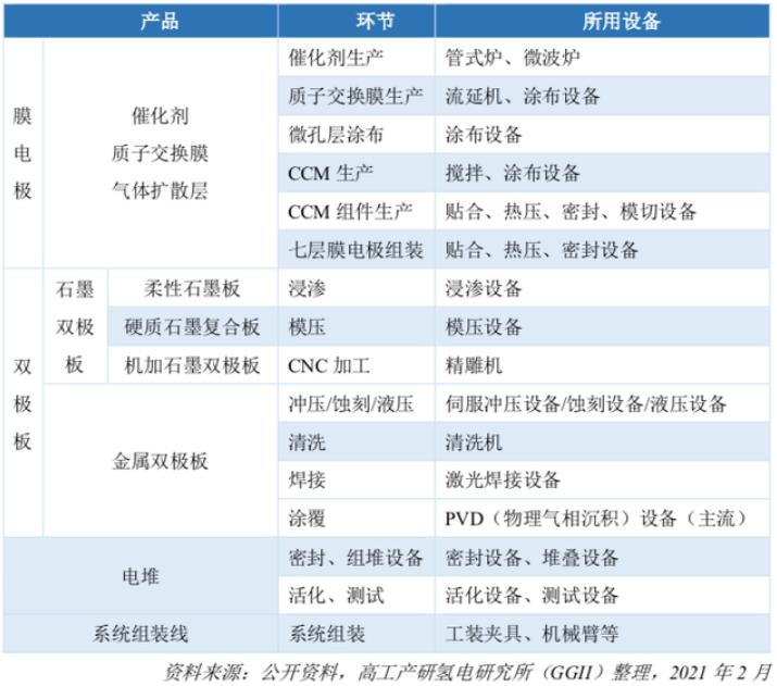 根據電堆的生產全流程,主要用到的設備有催化劑合成設備,膜電極涂布設備,石墨雙極板生產過程中的模壓、浸漬、CNC設備,金屬雙極板生產過程中的沖壓設備(蝕刻設備、液壓設備)、清洗設備、焊接設備和涂層涂覆設備,電堆組裝設備、活化設備等。