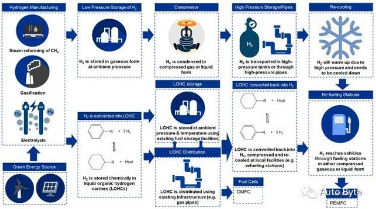 原則上,氫可以兩種形式存儲和運輸:純液體/氣體,或液態有機氫載體(LOHC)的形式,后者允許其與現有基礎設施一起存儲和運輸。氫能源CSD基礎設施的資本和運營成本主要受到轉化、存儲和分配成本的影響。