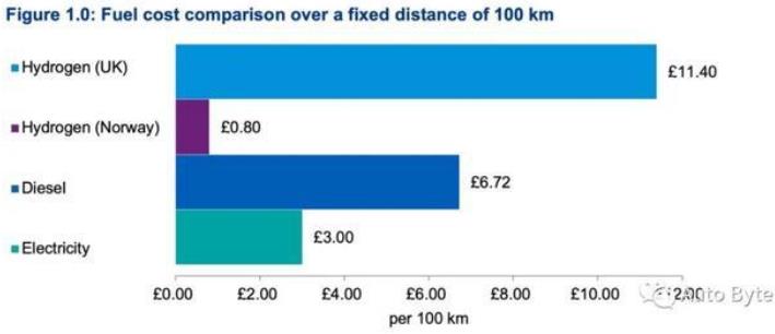 加利福尼亞能源委員會的一項研究估計,到2030年,每公斤氫能的成本可以從14—18美元降低到6.6—8.25美元,與現在的柴油價格相當。