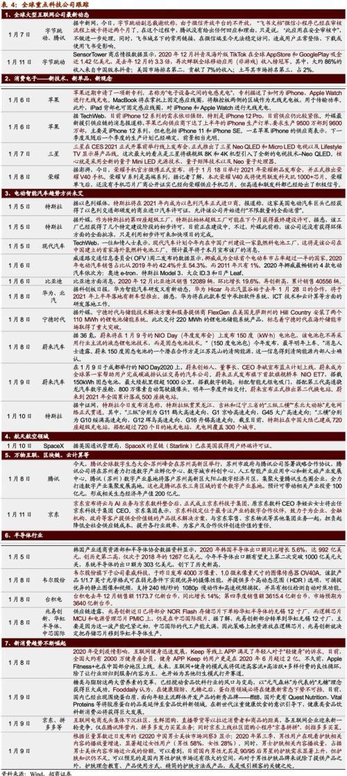 【全球產業趨勢】趨勢一:流媒體逐漸取代傳統媒體。疫情期間,海外電視流媒體平臺的用戶大幅上漲。上周,電視流媒體平臺龍頭ROKU股價大幅上漲26.8%。縱觀整個2020年,電視流媒體平臺ROKU漲幅為148%,音樂流媒體平臺Spotify大漲110.4%。趨勢二:新一輪科技周期繼續向上,全球電子元件與半導體現漲價潮。去年10月以來,半導體行業漲價潮頻現。本次漲價潮從上游的晶圓制造環節開始,逐步延伸至封測以及下游芯片、上游原材料,預計持續性較強。上周,電子元件與半導體產品板塊的股票出現普漲,韋爾股份、藍思科技、三安光電、臺達電領漲全球股市。趨勢三:固態電池技術獲得廣泛關注。上周,蔚來在NIODAY發布首款自動駕駛C級轎車ET7,并推出了最新固態電池包,帶電量150kWh,原位固化固液電解質,高性能硅碳負極(預鋰化),納米級包覆、超高鎳正極,實現360Wh/kg能量密度,整車實現續航超1000公里,預計2022年四季度開始交付,蔚來上周大漲17.2%。根據招商汽車汪劉勝團隊,本次蔚來發布的實際為半固態電池,且電池廠實際量產能力和量產穩定性有待驗證,對于目前市場格局和體系影響有限,但是固態電池技術進展需持續關注。