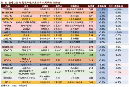 過去一周領跌的200億美元以上公司也主要集中在信息技術領域。多只熱門股票出現大幅度回調,如Zoom、NASPERS、VERISIGN等。