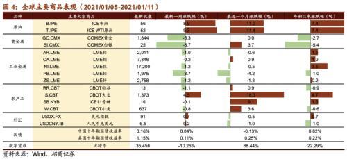 受益于沙特減產,上周原油大幅上漲。對于長期經濟復蘇及通脹的預期帶動10年期美債收益率連續多日上漲。民主黨橫掃國會和白宮,美元指數上升。貴金屬、工業金屬普跌。原油方面,OPEC+產油國于上周二達成協議,多數產油國將在2月和3月保持產量不變,沙特阿拉伯將自愿額外減產100萬桶/日,供給收緊帶來原油價格大幅上升,布油與WTI原油分別上漲8.9%、9.3%。貴金屬方面,由于10年期美債利率大幅上升,黃金與白銀分別下跌5.3%、8.7%。工業金屬方面,金屬鉛領跌3.7%,金屬鎳、金屬鋅、金屬鋁分別下跌1.2%、1.2%、1.0%。農產品方面,稻谷、ICE11號糖、小麥等紛紛回調,大豆受到美國出口大幅下跌及南美天氣炒作的影響大幅上漲4.5%。此外,美元指數上漲0.7%至91,人民幣相對美元升值0.2%,當前人民幣兌美元中間價為6.47,比特幣暴跌10.3%。