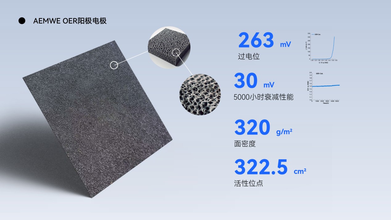 2. 陽(yáng)極電極:200 mA/cm2電流密度下263 mV過(guò)電位、5000小時(shí)30 mV的衰減