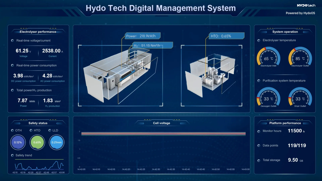 優越性能之外,HydoLyser?更是數字原生的制氫系統。結合HydoLyser?插片式構型與自研HydoOS?綠氫智能管理系統,海德氫能為客戶打造覆蓋全生命周期內的電解槽健康狀態監測與運維服務能力,基于HydoOS? CVM技術可實時監控單個小室的健康狀態,對于已識別的故障單片可在項目現場12小時之內完成快速的更換或升級,并嚴格遵循石化行業標準建立了完整的現場操作流程,運維成本降低至少90%以上,解決行業核心痛點。