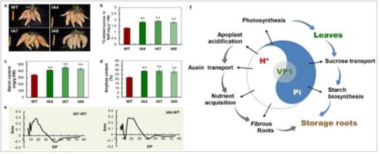 甘薯過表達VP1促進儲藏根產量和改善淀粉品質。VP1促進光合同化物動員及淀粉合成(a-e),實現Pi離子和氫質子的“陰-陽”雙調節(f),改善甘薯“源-庫”關系