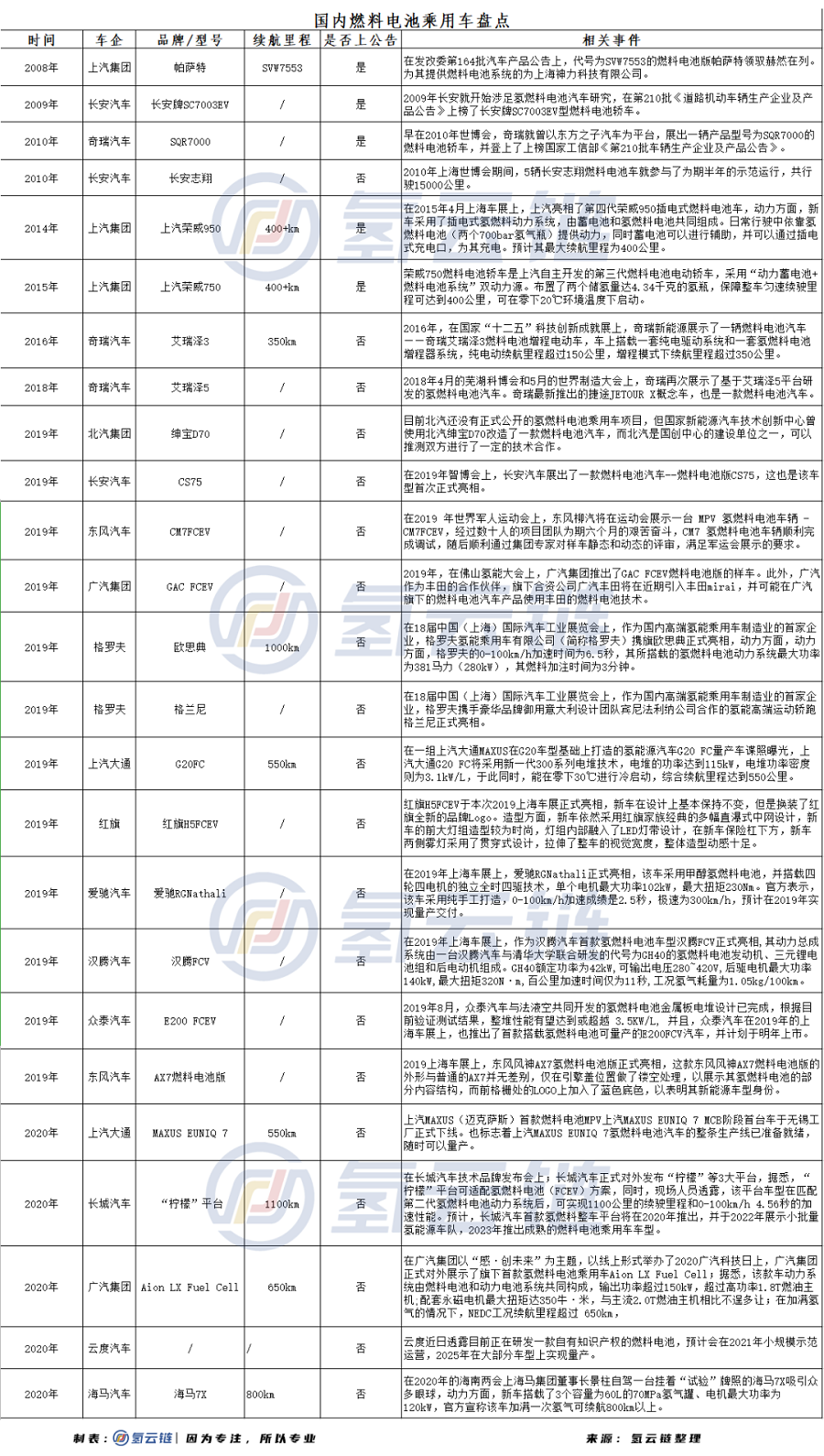 從表1可見,十多年來,以廣汽、長安、上汽、奇瑞、東風、北汽為代表的車企們仍一直在堅持燃料電池乘用車產品的開發。2021年開頭,國內主流車企開始在乘用車上發力,加快示范應用落地和車型量產步伐,其中東風汽車一馬當先,2月3號率先簽約至少100輛氫能乘用車項目訂單。