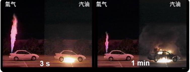 圖3 氫燃料電池汽車和汽油汽車的燃燒對比試驗