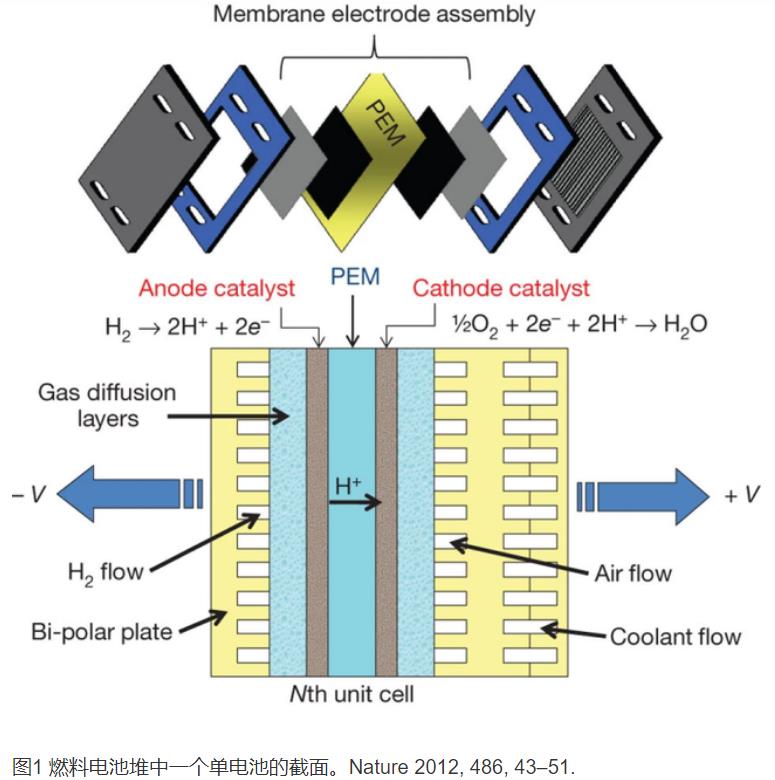 為了更為安全高效地將氫能運用到交通領域,人們轉向開發相對更安全的氫燃料電池,將氫能的化學能直接轉換為電能。氫燃料電池的工作原理是將氫氣的燃燒反應拆分成兩個半反應,利用兩個半反應之間的電位差實現電能輸出的一種能源轉化裝置。如圖1所示,空氣和氫氣在燃料電池中并不會直接接觸,而是通過正負極分別發生還原和氧化反應,完成氫氣的“燃燒”。這種方式不僅可以避免空氣和氫氣直接接觸燃燒,使得氫氣的使用更為安全,還直接將化學能轉化為電能,極大地提高了能源轉換效率。