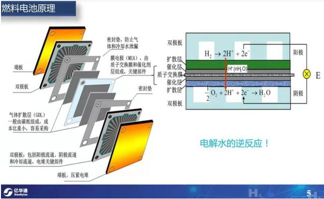 雖然目前政府對這個產(chǎn)業(yè)鏈的大力投入基本證明了可行性,但對個人來說,這種思考方式是對投資很有幫助的,搞清楚底層問題,才能更加堅定你的投資邏輯。首先看一下氫燃料電池的原理,燃料電池的概念最早1839年由英國的G.R.Grove提出,它不是跟天然氣汽車一樣靠燃燒帶動內(nèi)燃機做功,而是依靠電解水的逆反應(yīng)。工作過程是氫分子進入燃料電池的陽極,與覆蓋在陽極上的催化劑反應(yīng),釋放電子形成帶正電荷的氫原子,穿過電解液到達陰極,產(chǎn)生電流。陰極催化劑使氫原子與氧氣結(jié)合產(chǎn)生水。過程簡單而優(yōu)雅,全程零碳排放。