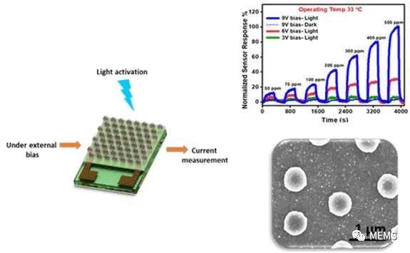 在光線照射激發(fā)下,傳感器的表面會(huì)使氫氣和氧氣發(fā)生反應(yīng)生成水。水改變了傳感器的電阻,從而實(shí)現(xiàn)空氣中氫含量的精確測(cè)量。這款傳感器的獨(dú)特優(yōu)勢(shì)是它可以在室溫下工作,測(cè)量濃度范圍覆蓋10~40000 ppm。當(dāng)氫氣濃度高到有爆炸危險(xiǎn)時(shí),它可以及時(shí)發(fā)出警報(bào)。此外,這款傳感器可以區(qū)分氫氣和其它氣體,選擇性超過(guò)93%。