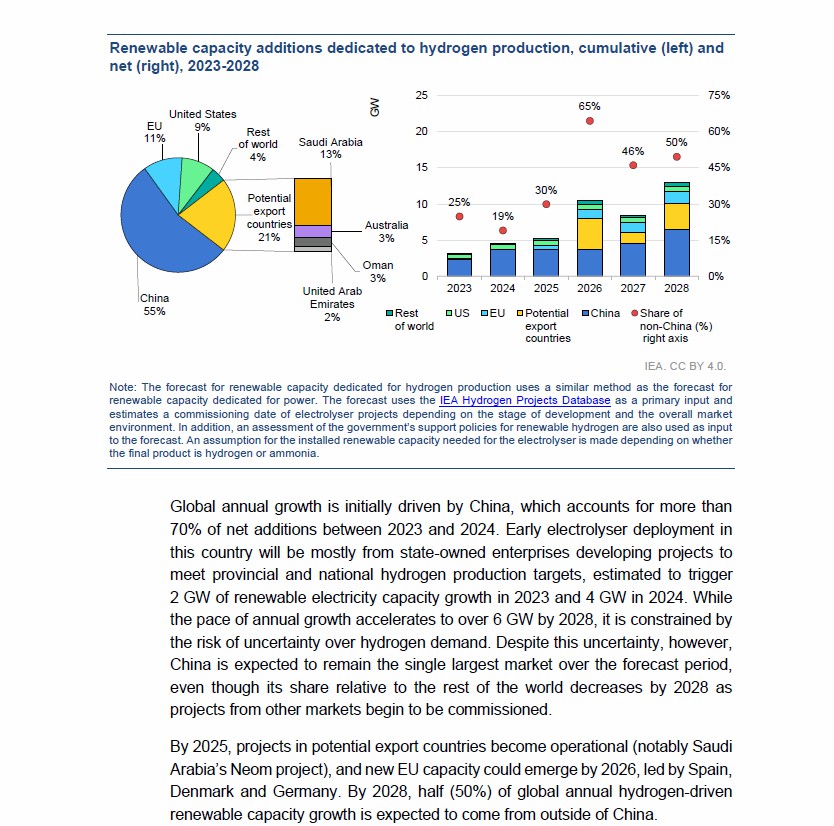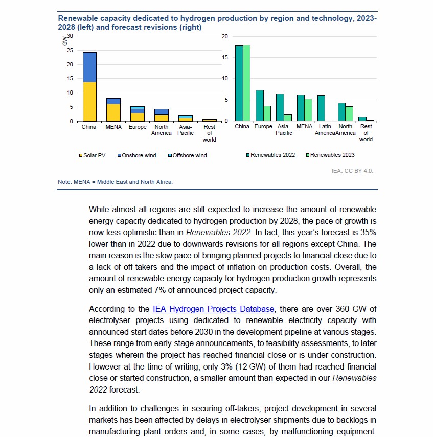 國際能源署IEA最近發(fā)布的報告《2023可再生能源:2028年分析和預(yù)測Renewables 2023 Analysis and forecast to 2028》中,大幅削減了對未來五年新增風(fēng)能、太陽能用于生產(chǎn)綠氫的估計,這意味著可再生氫的產(chǎn)量將低于此前預(yù)期。
