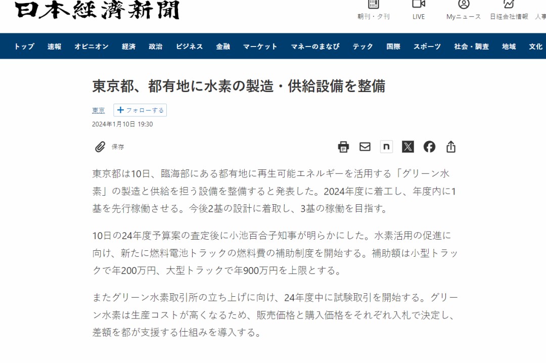 東京政府公布2024財年三個綠氫項目,并啟動系列可再生氫補貼計劃
