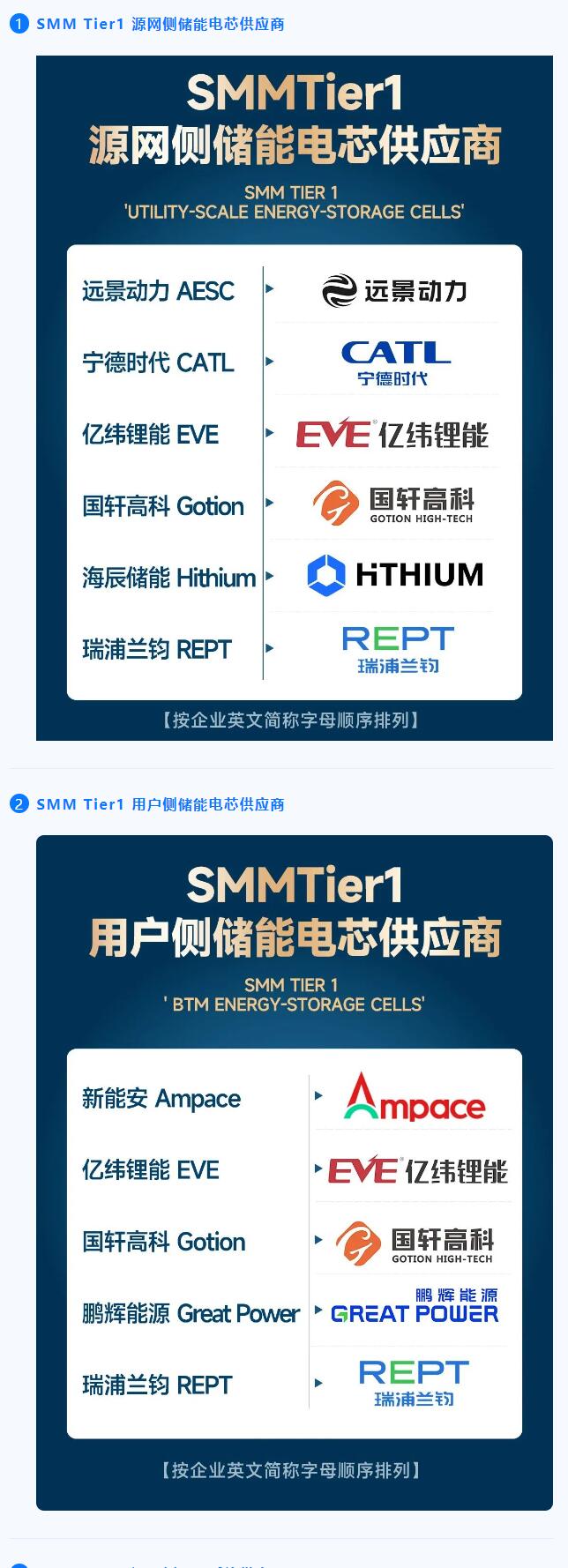 SMM Tier1源網側儲能電芯供應商/用戶側儲能電芯供應商評選: