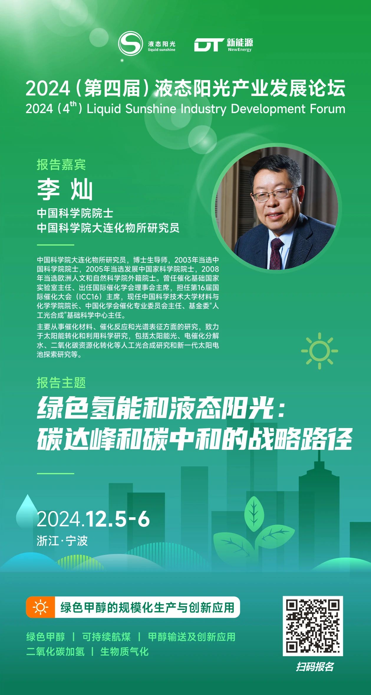 液態(tài)陽光、DT新能源特邀請中國科學(xué)院院士、中國科學(xué)院大連化物所研究員 李燦出席2024(第四屆)液態(tài)陽光產(chǎn)業(yè)發(fā)展論壇,并作主題報告《綠色氫能和液態(tài)陽光:碳達(dá)峰和碳中和的戰(zhàn)略路徑》。