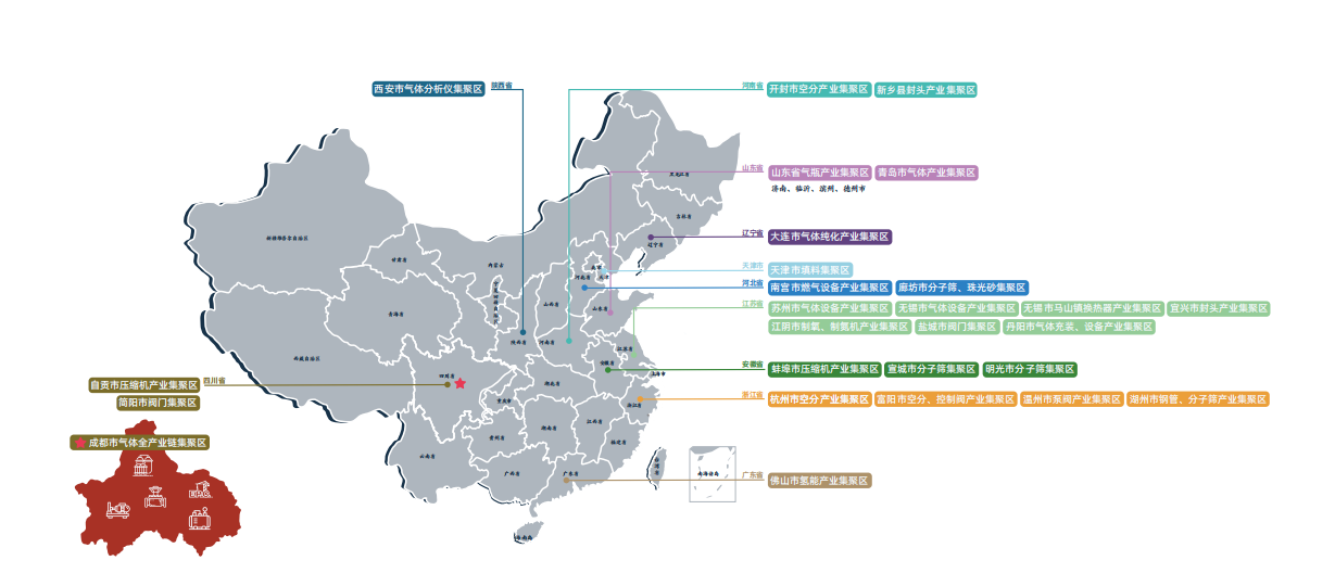 以簡陽、富陽、丹陽、宜興、新鄉、南宮等氣體產業集聚區為代表展示中國工業氣體產業集聚區的整體實力。