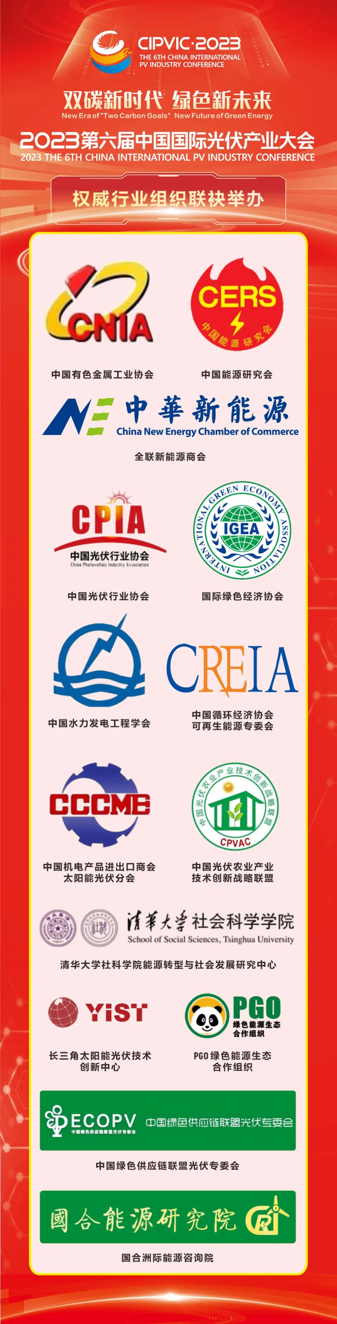 大會(huì)由中國(guó)有色金屬工業(yè)協(xié)會(huì)、全聯(lián)新能源商會(huì)、中國(guó)能源研究會(huì)、中國(guó)光伏行業(yè)協(xié)會(huì)、國(guó)際綠色經(jīng)濟(jì)協(xié)會(huì)、中國(guó)水力發(fā)電工程學(xué)會(huì)、中國(guó)循環(huán)經(jīng)濟(jì)協(xié)會(huì)可再生能源專(zhuān)委會(huì)、中國(guó)機(jī)電產(chǎn)品進(jìn)出口商會(huì)太陽(yáng)能光伏分會(huì)、清華大學(xué)社科學(xué)院能源轉(zhuǎn)型與社會(huì)發(fā)展研究中心、中國(guó)光伏農(nóng)業(yè)產(chǎn)業(yè)技術(shù)創(chuàng)新戰(zhàn)略聯(lián)盟、長(zhǎng)三角太陽(yáng)能光伏技術(shù)創(chuàng)新中心、中國(guó)綠色供應(yīng)鏈聯(lián)盟光伏專(zhuān)委會(huì)、PGO 綠色能源生態(tài)合作組織、國(guó)合洲際能源咨詢(xún)?cè)旱瘸夜夥履茉搭I(lǐng)域權(quán)威行業(yè)組織聯(lián)袂舉辦。