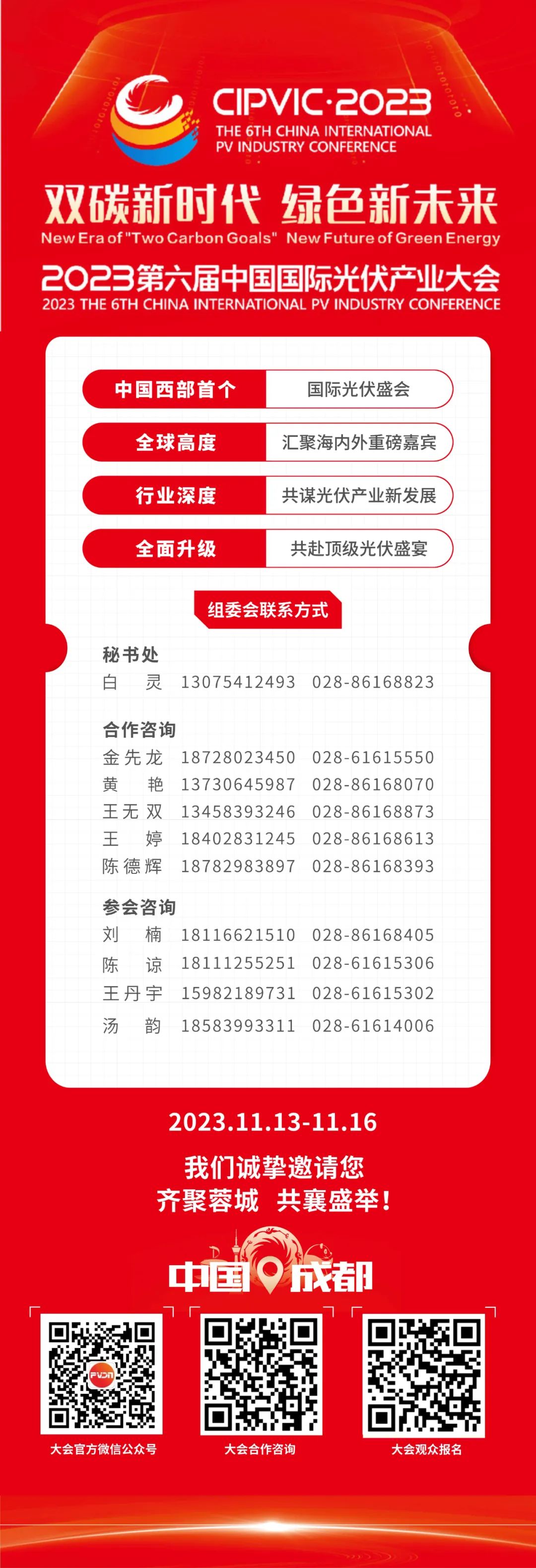 聚鏈逐“光”,中國(guó)西部光伏產(chǎn)業(yè)發(fā)展勢(shì)頭強(qiáng)勁!11月13-16日,2023第六屆中國(guó)國(guó)際光伏產(chǎn)業(yè)大會(huì)將于成都世紀(jì)城新國(guó)際會(huì)展中心隆重舉行。作為我國(guó)西部首個(gè)國(guó)際光伏盛會(huì),大會(huì)已匯聚海內(nèi)外重要領(lǐng)導(dǎo)、重磅嘉賓、行業(yè)大咖及數(shù)百家龍頭企業(yè)參與。