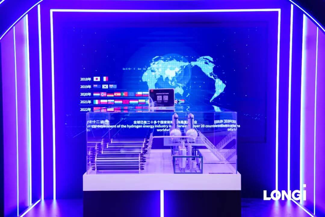 而就在舞臺另一側,氫能展區也分外奪目。本次最神秘和最矚目的亮點,當屬“4對1”制氫系統解決方案模型,這是隆基氫能首次出展SNEC,也是“4對1”制氫系統解決方案首次作為重磅作品亮相行業展會。炫目的展臺門庭若市,專業講解員娓娓道來,為嘉賓及客戶獻上一輪輪詳細和深入的介紹,引起各界的好評如潮。