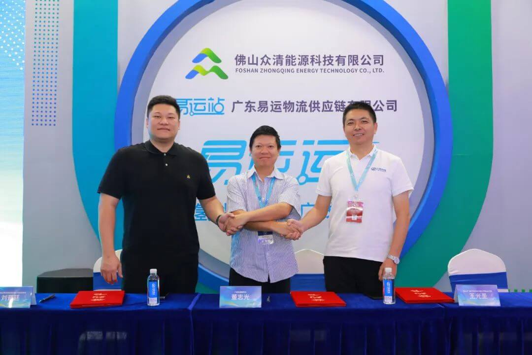 展會期間還舉辦了“綠色運蔬 從氫開始”百車采購協議”簽約儀式,廣東易運物流供應鏈有限公司副總經理劉晉延、物流供應鏈事業部總監何偉輝,廣順集團董事長董志光,飛馳科技副總經理王光圣等企業領導出席簽訂儀式。此次協議的簽訂,一方面旨在貫徹落實《廣東省加快氫能產業創新發展的意見》,以氫能應用場景推動“制、儲、運、用”全產業鏈條發展,利用《綠色運蔬》農貿物流園應用場景,推廣應用氫能冷鏈運輸車,另一方面三方將共同組織優勢資源,以燃料電池示范城市群應用為結合點,在廣東示范城市群地區共同合作推廣100輛飛馳牌4.5T燃料電池冷藏運輸車。《百車采購協議》的簽署給氫能物流運輸車應用端帶來創新的合作運營模式,同時本次簽約是《綠色運蔬》項目落地中最為重要的環節,也是三方打造廣東省氫能應用示范園重要的第一步。