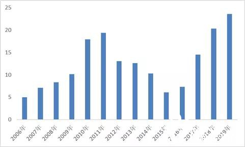 圖3 國內(nèi)挖掘機(jī)歷年銷量(單位:萬臺(tái))