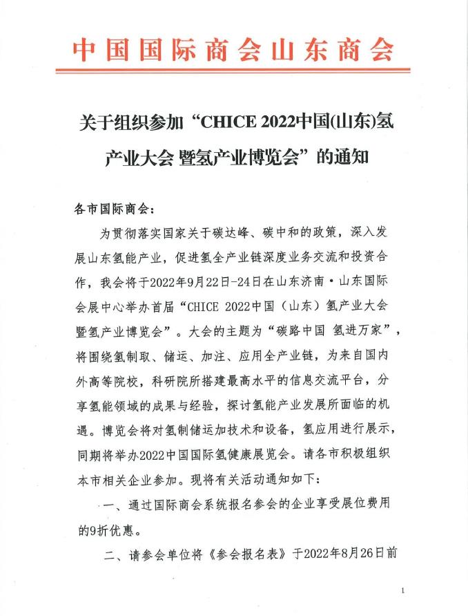 [ 導讀 ]2022年9月22日-24日在山東濟南·山東國際會展中心舉辦首屆“CHICE 2022中國(山東)氫產業大會暨氫產業博覽會”