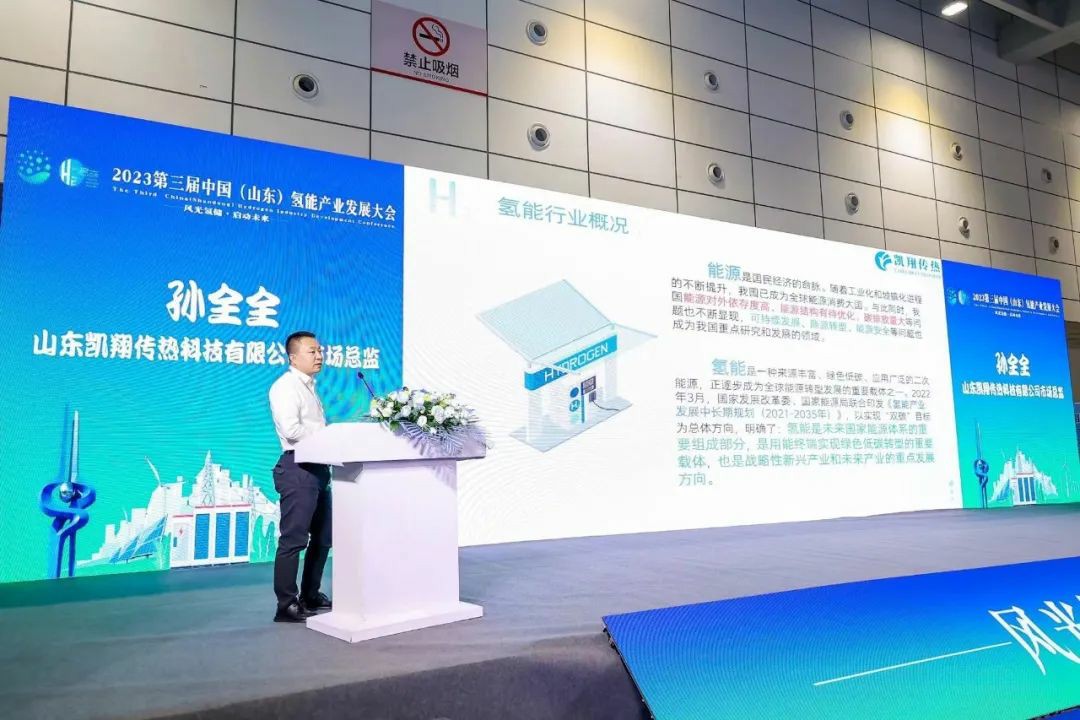 山東凱翔傳熱科技有限公司市場總監孫全全發表《冷卻塔在氫能行業的應用及優勢》主題演講,凱翔傳熱以“為實現冷卻系統節能、節水、低碳運行奠定理論基礎,助力雙碳目標”為出發點,研發出Casen-高效型空冷器、Casen-智能高效節水一體式換熱站、Casen-“智冷云”管理與控制系統產品。