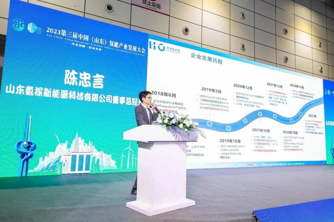 山東氫探新能源科技有限公司董事總經理陳忠言進行了主題為《氫電能源管理系統技術和實踐》的分享,陳忠言總經理在演講中分析了用戶自建氫能源系統的痛點并提出解決方案,同時介紹了公司以燃料電池控制技術為核心的燃料電池發電系統開發、以氫電能源管理技術為核心設計集成的氫電一體化系統。