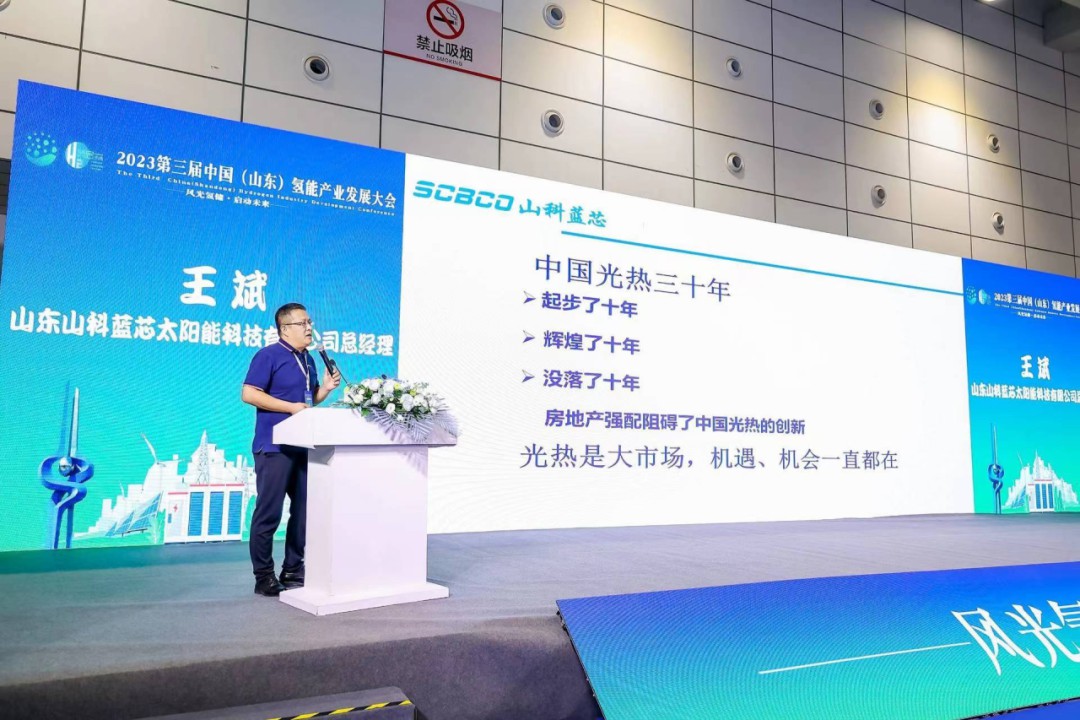 山東山科藍芯太陽能科技有限公司副總經理王明輝代總經理王斌發言,以《壓層無隱裂PVT將開啟光熱應用的新時代》為主題進行分享。演講中提到,能源變革時代已經來臨,光熱是大市場,機遇、機會一直都在,層壓無隱裂PVT將開啟光熱應用新時代。